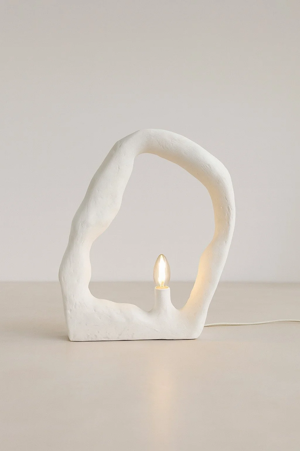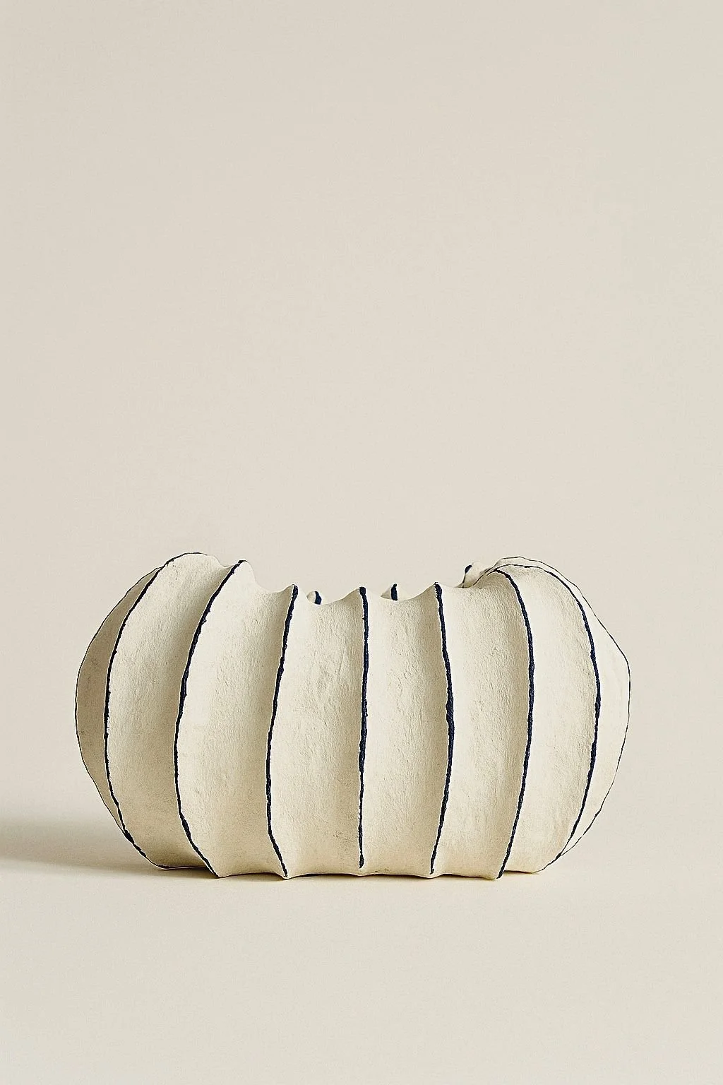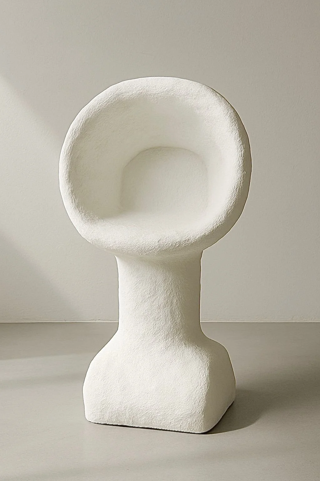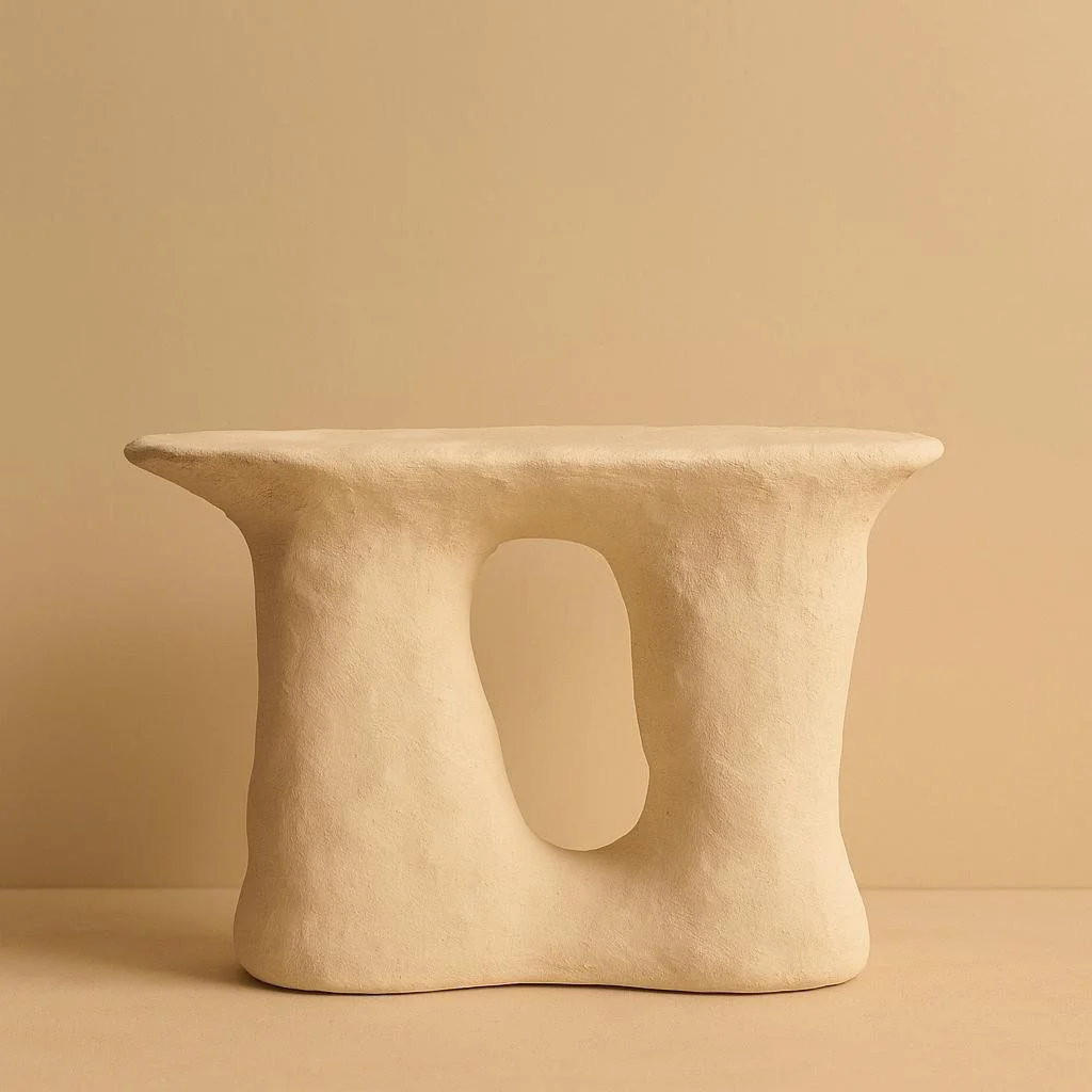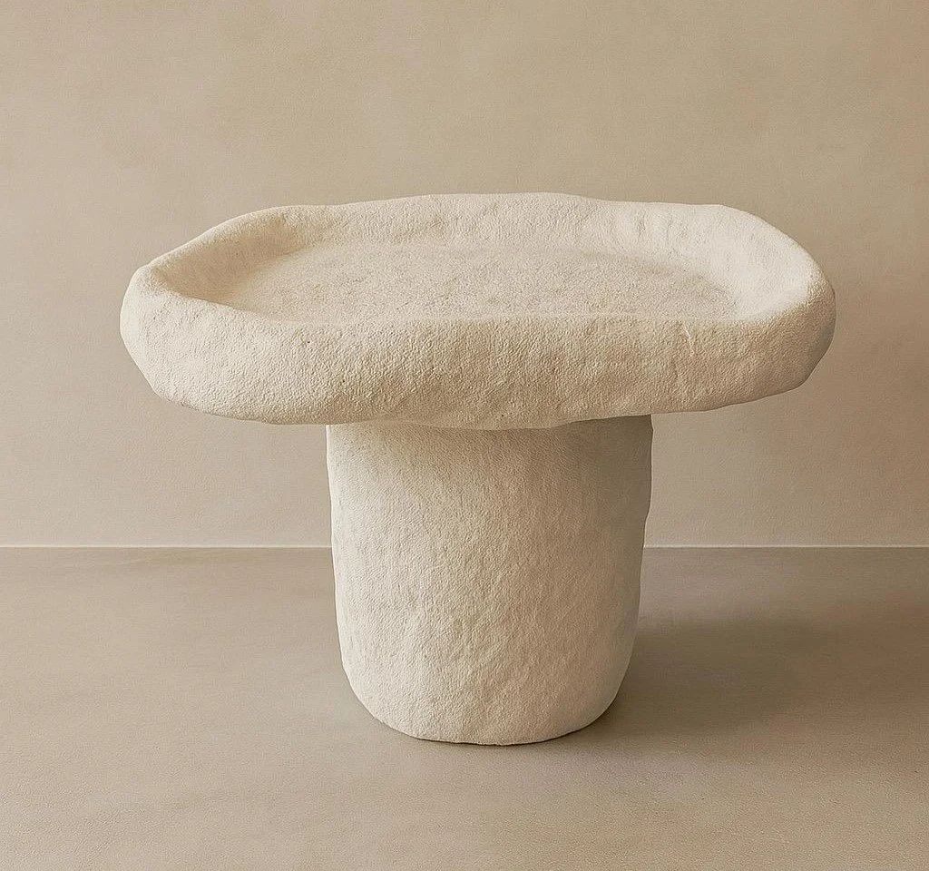 The production combines recycled cardboard bases with carefully layered paper and a final decorative plaster finish, resulting in unique, sustainable objects designed for both indoor and outdoor use.